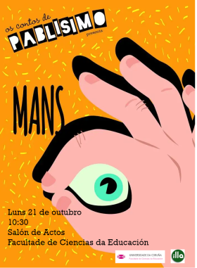 El lunes 21 de octubre, la Facultad de Ciencias de la Educación contará con la visita del actor y narrador Pablísimo, en el marco de los talleres de narración oral coordinados por las profesoras Iria Sobrino y Montserrat Muriano. El público podrá asistir al espectáculo Mans y participar en un coloquio posterior con el invitado.
